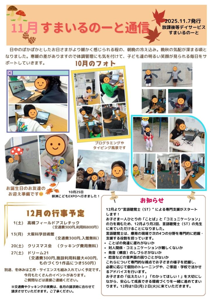 今月11月も、モルック大会やむろいけの森へ行ったりと楽しい予定が盛りだくさんです。